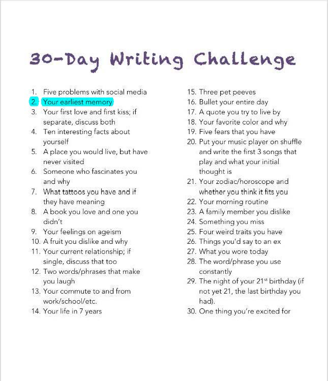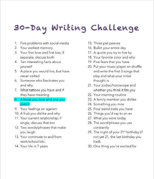 Towards the tail end of October, The Writer’s Circle posted a photo on Facebook that contained a 30-Day Writing Challenge. I liked the questions and I liked the idea of sharing a little bit more information about me (as opposed to my strange Internet reading habits), I decided to join in! If you’re participating – go ahead and leave a comment with your links below!